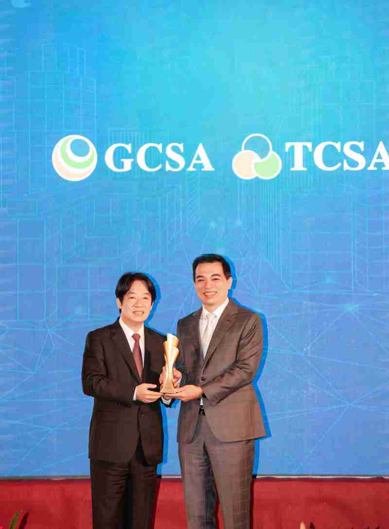 达全方位永续表现获全球永续奖及台湾永续奖肯定,,,,由副总统赖清德颁奖 (左),,,28国际总经理柯富仁 (右) 代表领奖